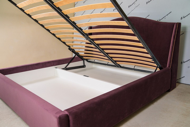 Каркас изготовлен из 8, 12 и 16 мм фанеры, и соснового бруса. В качестве наполнителя использован ELAX высокой плотности. Бельевой короб из ЛДСП. Установлено усиленное ортопедическое основание с подъемным механизмом на газ-лифтах. Скрытые опоры. На царгах кровати цельный съемный чехол.