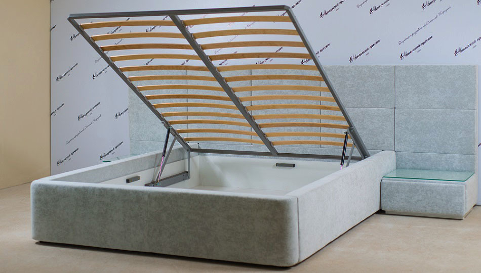 Каркас изготовлен из 8, 12 и 16 мм фанеры, и соснового бруса. В качестве наполнителя использован ELAX высокой плотности. Бельевой короб из ЛДСП. Установлено усиленное ортопедическое основание с подъемным механизмом на газ-лифтах. Скрытые опоры. На царгах кровати цельный съемный чехол.