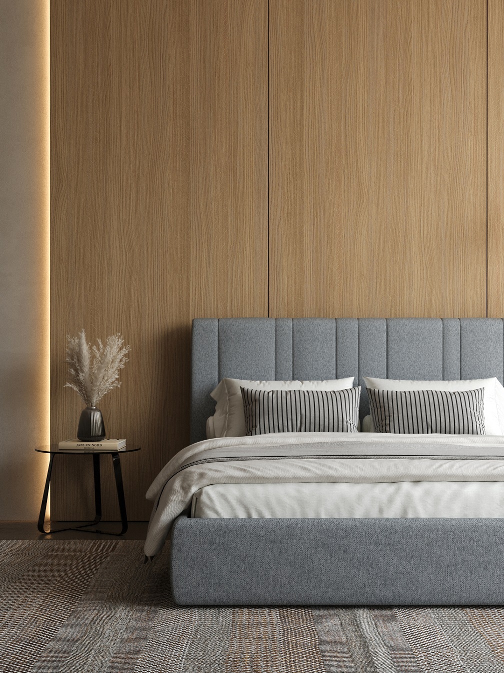 Модная отстрочка изголовья кровати в виде вертикальных полос придает лоск и уникальность данной модели.